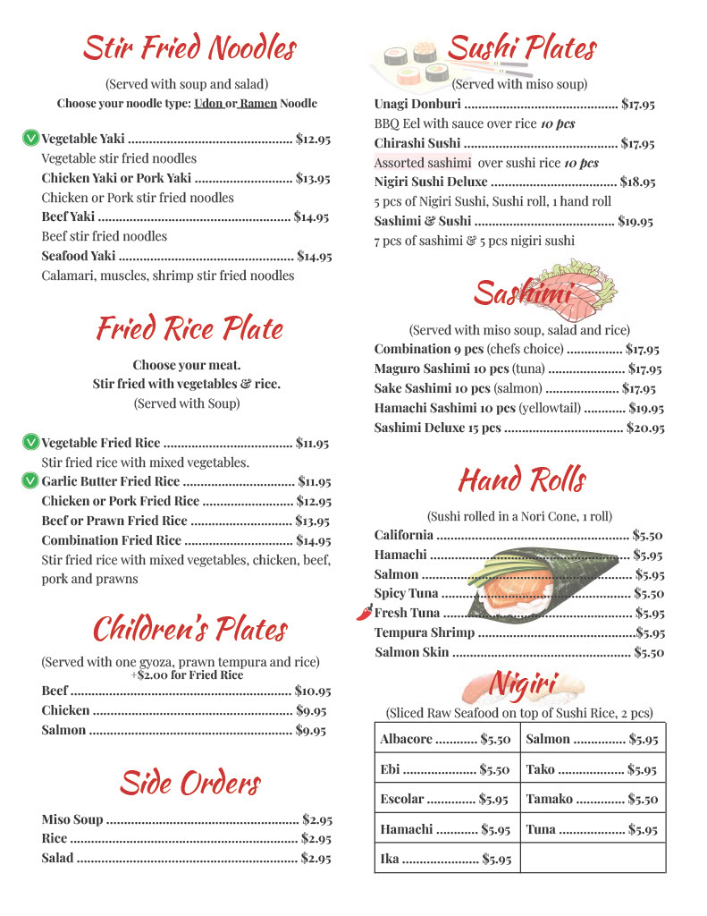 Shrimp and mixed vegetables (usually yam, broccoli, zucchini) dipped in tempura batter and deep fried. Comes with Tempura Sauce.